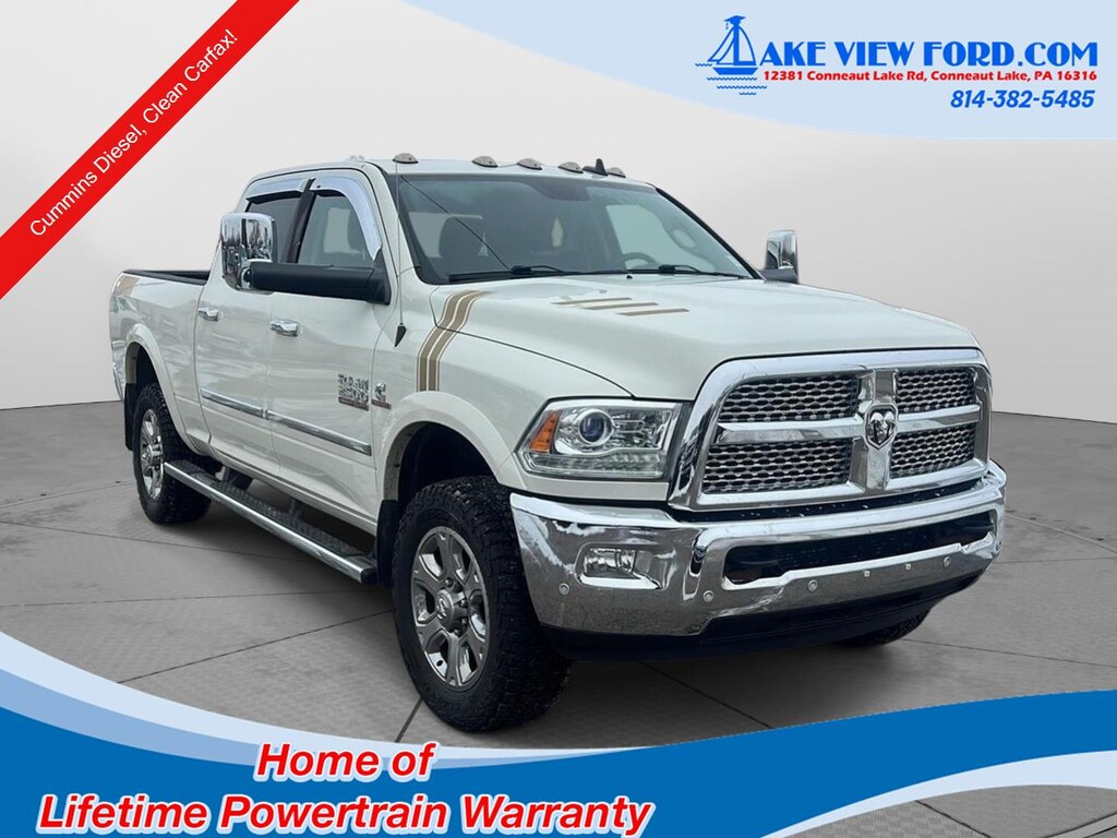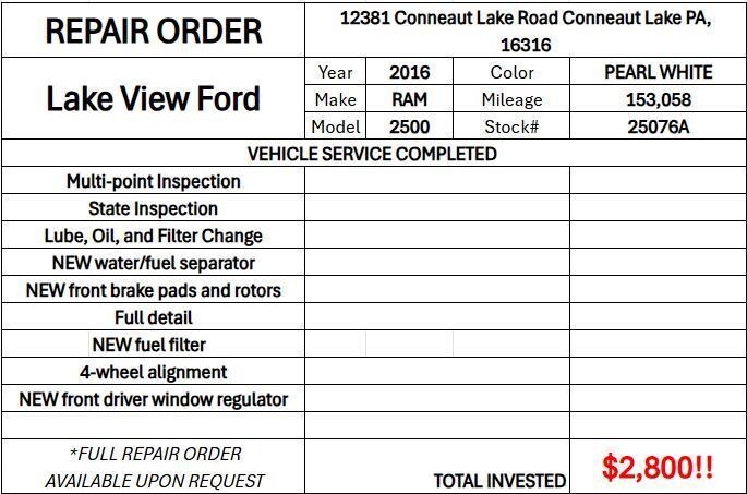 This 2016 Ram 2500 Laramie has a beautiful Pearl White exterior with Black interior. This vehicle has 158,062 miles has been thoroughly inspected by our factory trained service technicians and has been fully reconditioned for immediate delivery. We're happy to provide this 2500's CARFAX vehicle history report upon request as well.